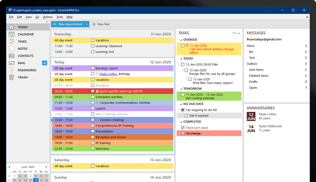 多合一:使用EssentialPim,您无需在邮件,任务和日历应用程序之间不断切换即可计划您的一天。为了方便起见,EssentialPim可以让您在单个应用程序中管理所有内容。