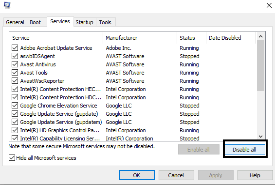 按Windows键 + r打开“运行对话框”。在对话框中输入MSCONFIG,然后单击OK.GO。到达系统配置窗口中的“服务”选项卡。检查旁边的盒子以隐藏所有Microsoft Services.click on the the the the aster.click按钮。