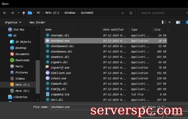 步骤7)文件资源管理器将弹出;默认情况下,它将在thecdrive中打开WindowsDirectory。向下滚动并查找theshutdown.ESEPROGRAM,选择它,然后单击洋葱。