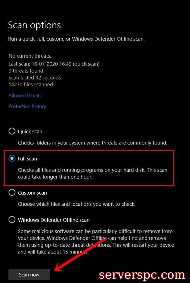 单击开始菜单,然后搜索病毒和威胁保护。然后单击扫描选项,然后从菜单中选择完整扫描。请记住,这种类型的扫描将占用大量时间,但是到目前为止,这就是小时的需求。在这方面,快速扫描可能不会给出所需的结果。