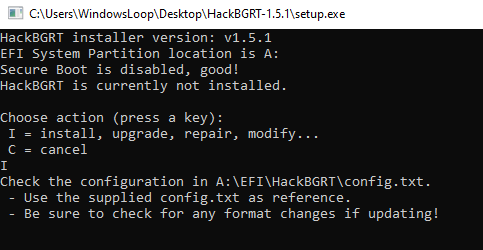 步骤3)命令行工具将弹出,因为hackbgrt通常是编写用于覆盖Windows徽标的脚本。出现命令行工具后,将在此提及指令。按I键盘上的i开始安装过程。