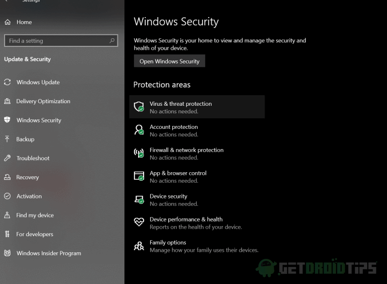 步骤2)现在,在窗户的右窗格上,转到Windows SecurityTab,在右侧,单击病毒威胁保护。