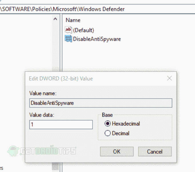 步骤4)设置值名Asdisableantispywareand设置值数据AS1。确保选择了hexadecimaloption,然后单击OKBUTTON。