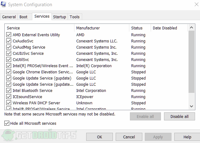 服务或任何启动应用程序可能与应用程序相抵触,因此导致错误。因此,禁用所有第三方服务,并禁用所有启动的应用程序。