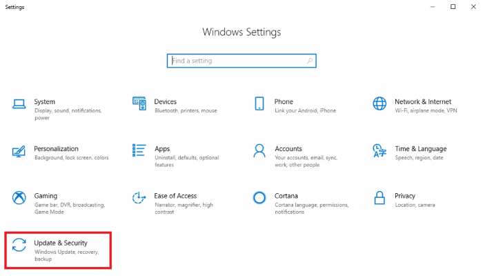 步骤2)在Windows设置窗口中选择Theupdate SecurityOption。