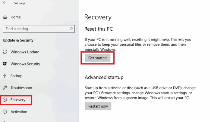 步骤3)现在,单击窗口的左窗格上的therecoveryOption,然后在窗口的右窗格上单击“恢复部分”下的get启动按钮。