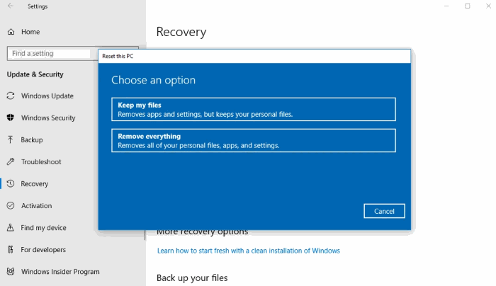 步骤4)提示将出现,您将没有两个选择。如果要保留应用程序和个人设置,则可以选择“我的文件”。否则,如果要从系统中删除所有内容,则可以选择“删除所有选项”。