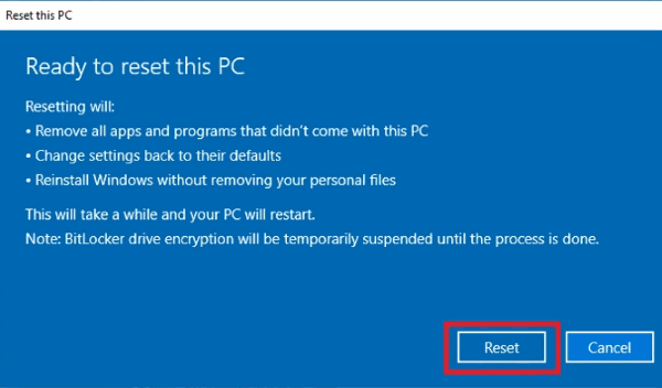 步骤5)现在,单击重置按钮以将PC重置出厂。一段时间后,您的设备将重新启动,现在您会注意到您的窗口又回到了默认状态。