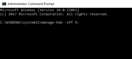 步骤2)键入命令manage -bde -off x:并按键盘上的输入。而不是X键入硬盘地址。