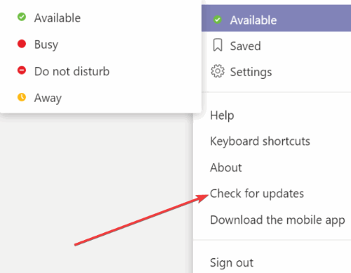 步骤1)打开Microsoft团队,然后单击屏幕顶部的用户Iconat。步骤2)将出现一个下拉菜单;单击检查以获取更新。