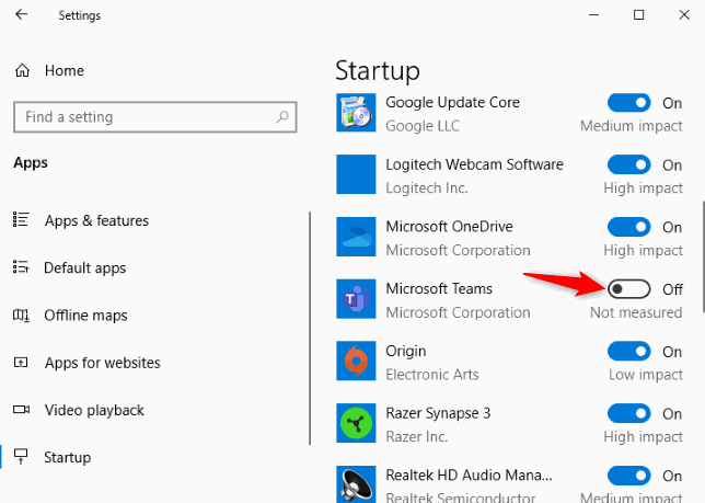 步骤3)导航,向下滚动并找到Microsoft团队,请切换将其关闭的选项。