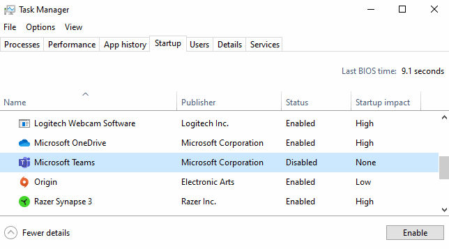 步骤3)向下滚动以找到Microsoft团队,右键单击它,然后选择ThedisableOption。您还可以选择Microsoft团队选项,然后单击“任务管理器”窗口下方的ThedisableButton。