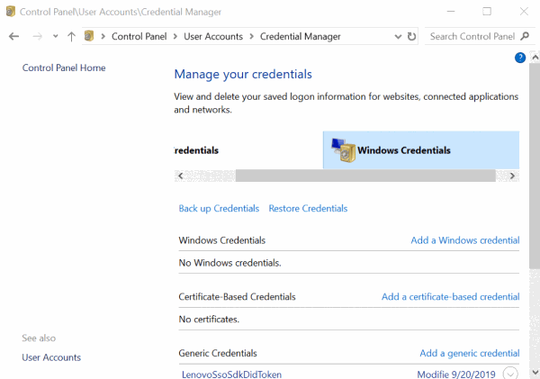 步骤2)在打开Theuser帐户选项上打开thecontrol Panelick之后。然后转到凭据管理器和选择“窗口凭据”选项。