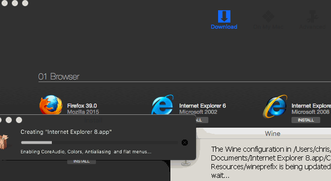 您可以从Winebottler应用程序下载一些Windows应用程序,例如Internet Explorer。您可以直接从应用程序安装Windows应用程序,但首先,它将下载一些必要的库,因此请确保您的Internet连接已打开。