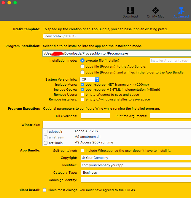 从官方Winehq网站上安装Wine and Winebottler。从应用程序文件夹中,运行Winebottler应用程序。