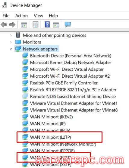 现在,扩展网络适配器部分,并确保那里存在WAN Miniport(PPTP)和WAN Miniport(L2TP)。