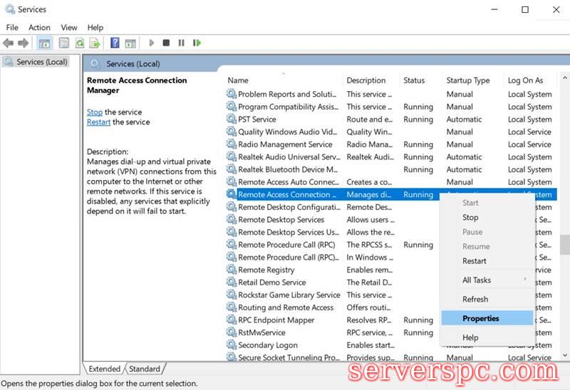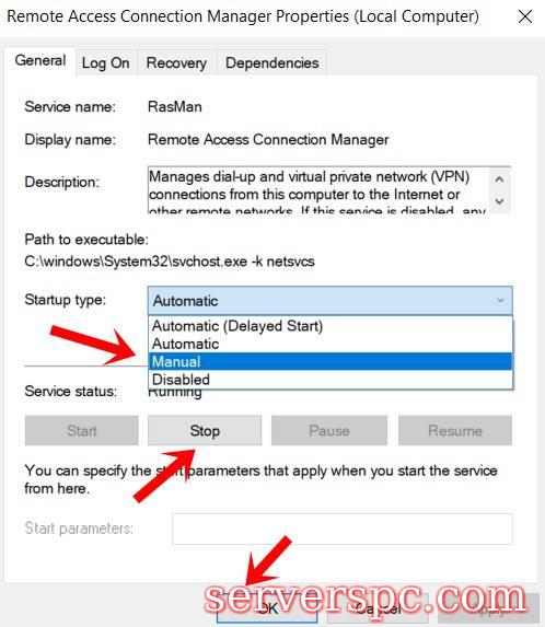 接下来,滚动,直到您在右侧菜单中到达远程访问连接管理器选项。在其上点击右键并选择属性。然后从“ RAC属性”对话框中,转到“常规”选项卡。将启动类型从自动更改为手动。