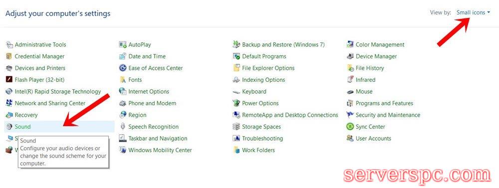 从开始菜单打开控制面板,然后单击位于右上角的类别选项。从列表中选择小图标。然后单击声音。