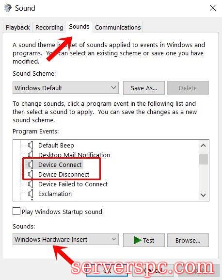 转到“声音”选项卡和“程序事件”部分,查找设备连接和设备断开连接。然后单击“声音”选项,然后选择“无”,对于这两个选项。点击确定。