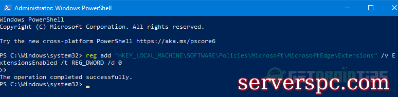 reg添加“ hkey_local_machine \ software \ policies \ microsoft \ microsoft \ microsoftEdge \ Extensions” /v ExtensionsEnabled /t reg_dword /d 0 0![]()