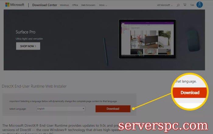 访问Microsofts官方网站,然后访问DirectX下载页面,然后单击“红色下载”按钮。