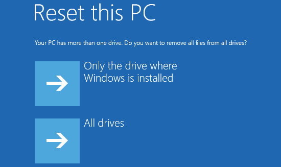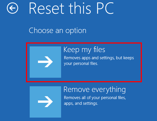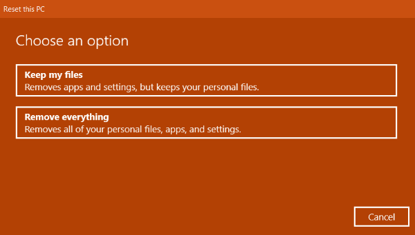 注意:选择保留我的文件选项时,将删除所有第三方软件和应用程序,但是您的个人文件将被保存。但是,如果您选择“删除所有选项”,它将删除所有保存在设备硬盘中的数据。