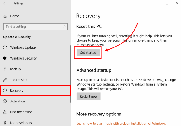 单击“恢复”选项卡,然后在此PC下选择“重置”下启动选项。