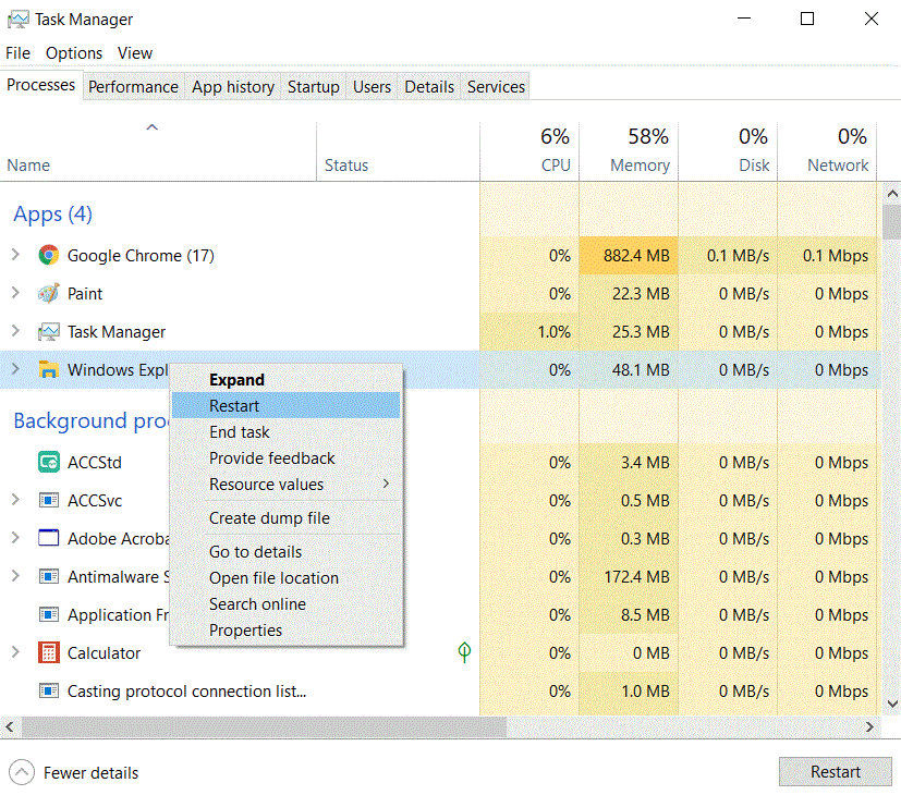如果Windows 10上的任务栏在全屏模式下没有隐藏,则可以尝试重新启动Windows Explorer。实际上,与重新启动计算机相比,此修复程序更快。按CTRL+SHIFT+DEL按钮或悬停在任务栏,然后右键单击任务管理器,然后转到Windows Explorer,然后单击重新启动。