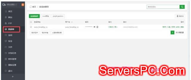 1、成功登录到宝塔面板后,您可以在宝塔面板后台界面,选择“数据库”菜单项,进入数据库管理界面,如下图所示: