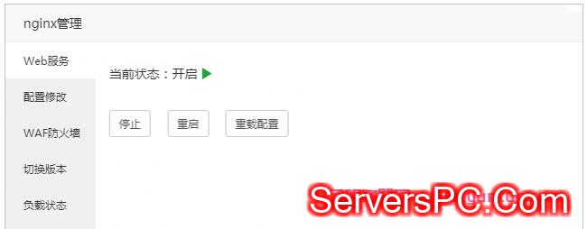 在Nginx管理界面,您将会看到有Web服务、配置修改、WAF防火墙、切换版本、负载状态等多个菜单项。切换到Web服务选项卡,在该页面中,您可以停止或重启当前Nginx服务和重新加载Nginx配置文件。