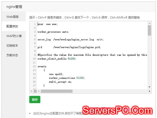 另外,您也可以切换到“配置修改”选项卡,修改当前的Nginx的配置文件,如果需要使当前配置生效,请在Web服务中重载配置文件。
