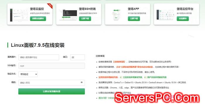 安装宝塔Linux面板的服务,如果您不想自己登录服务器做繁琐的安装操作,在下方图片指引中,直接输入服务器的登录资料即可在线一键安装宝塔面板,全自动安装无需任何人为操作。