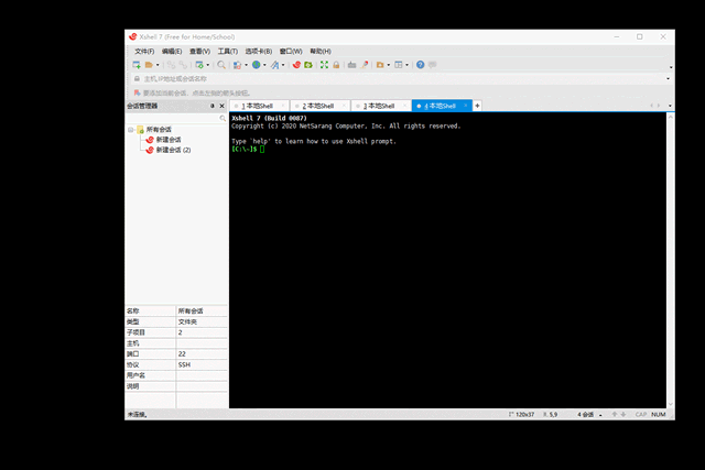 下面我们演示一下:当我在一个Xshell窗口中打开了4个选项卡时,此时再右键创建一个新的选项卡,那么Xshell会自动创建一个新的窗口,并在新窗口中打开选项卡,而不是在原有窗口基础上打开第5个选项卡。