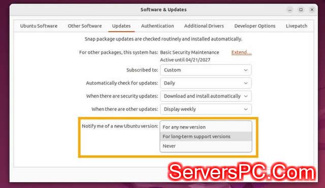 2、在这里,下拉菜单将For long-term support versions更改为For any new version,修改生效后,后续有Ubuntu新版本发布的话,即可收到通知提醒,不管是长期支持还是短期支持版本。