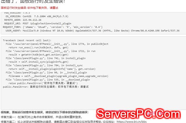 今天,小白在安装宝塔nginx防火墙专业版结果报错,面板运行时发错错误:软件包下载失败,请重试!通过宝塔官方论坛了解到:近期上海机房连接广东电信、或我司广东其他节点存在异常。大多表现在用户访问宝塔面板时加载软件商店慢、打不开或绑定不了账户;或登录面板首页直接报错【面板运行时发生错误: 解析软件列表发生错误,已尝试自动修复,请刷新页面重试!