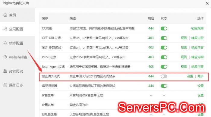 2、打开防火墙的设置-全局设置中可以看到-禁止海H外访问,禁止XX以外的地区访问站点;开启这个功能就可以了,他是通过IP段来屏蔽或者是放行的,所以也有可能存在信息同步不及时以及误判等情况。