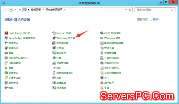 2.在计算机控制面板中,可以点击进入“windows防火墙”,如果界面不清楚可以右上角查看方式,选“小图标”,如下图所示: