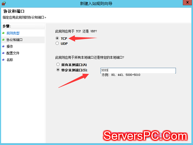 5. 选择“新建规则”在弹出的列表中建立需要开放远程连接端口号(以3333为例),开放端口的具体操作步骤如下图所示: