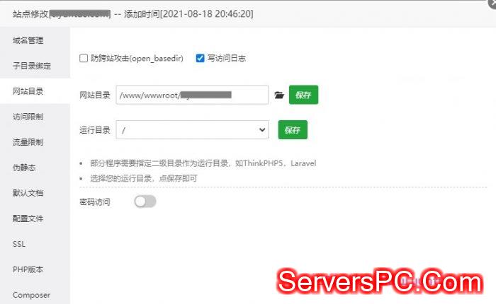 还是在站点修改页面,切换到“网站目录”项,这里可以设置当前站点的目录地址、站点程序的运行目录、防跨站攻击、写访问日志。