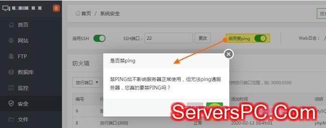 首先登录到宝塔面板后台,然后在左侧菜单栏选择“安全”选项,导航到右侧页面上方,我们会看到有“启用禁ping”按钮,鼠标点击该按钮,使其处于绿色开启状态,便成功打开了禁ping功能,如下图所示: