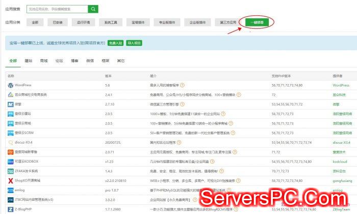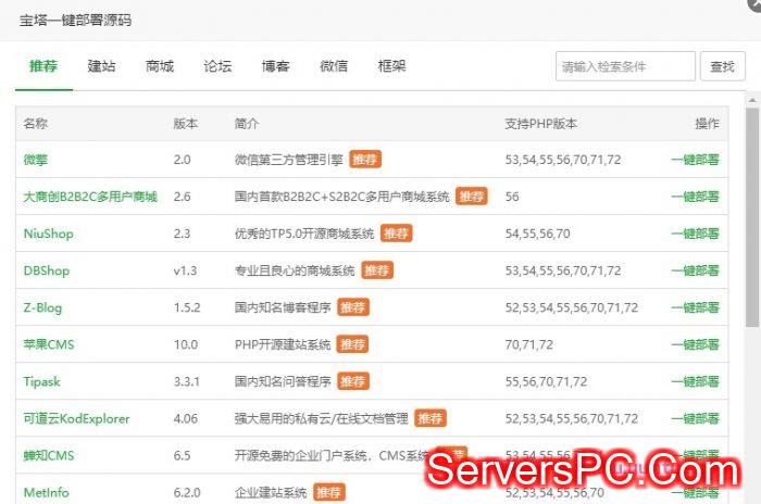 安装好之后,打开这个插件,里面会包含一些常见的程序源码,包含建站、商城、论坛、博客等。选择需要的程序源码,点击“一键部署”即可。