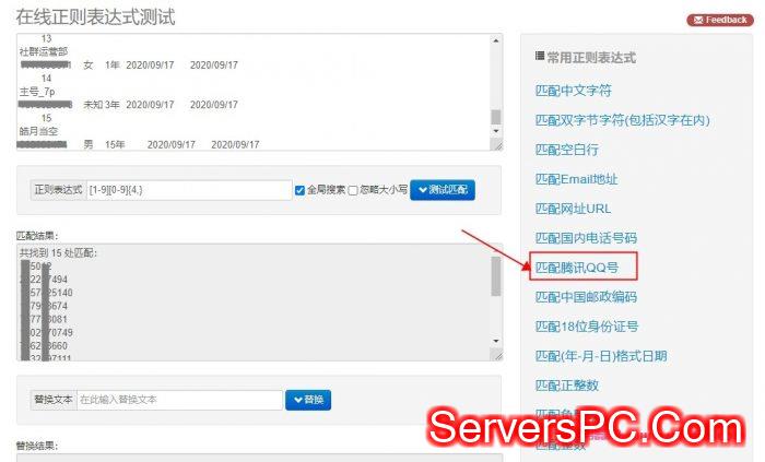 3、打开在线正则表达式地址 http://tool.oschina.net/regex 粘贴刚才复制的内容,再点击“匹配腾讯QQ号”即可看到匹配结果了。如下图: