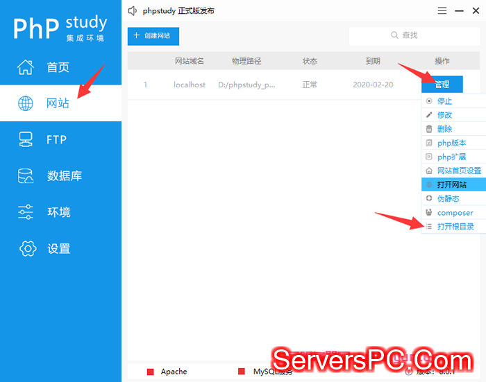 2、点击左侧网站栏目,然后点击右侧管理——打开根目录