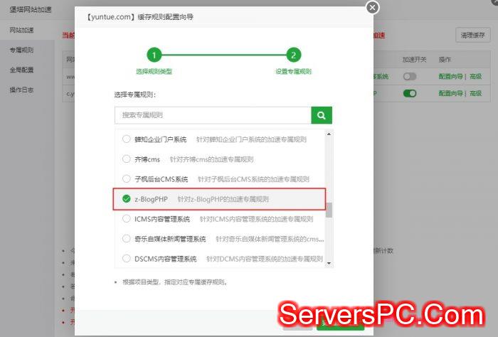 3.然后在专属规则中选择你当前使用的网站程序,里面已经内置了绝大多数主流的网站程序。比如本站是z-blogphp程序,我们选择之后,点“完成规则配置”即可。