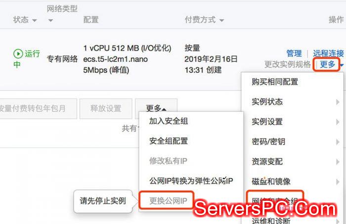注意:在更换公网IP之前,需要先停止实例;另外,如果实例创建后超过6小时,“更换公网IP”选项就消失了。