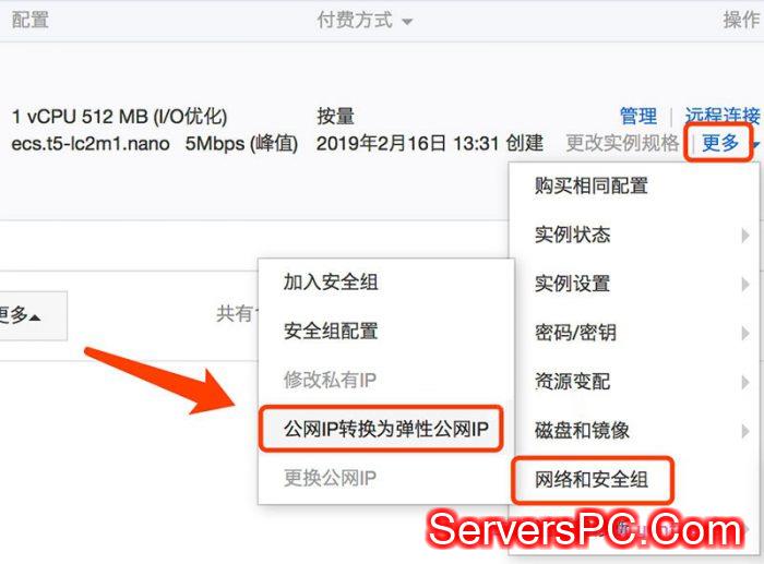 3. 点击“更多”–“网络和安全组”–“公网IP转换为弹性公网IP”