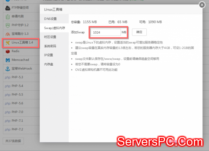 这时,我们就需要进行如下操作:找到宝塔面板的“软件管理”->找到“Linux工具箱”->打开,找到“Swap/虚拟内存”,然后将“添加Swap”设置成1024MB,如下图