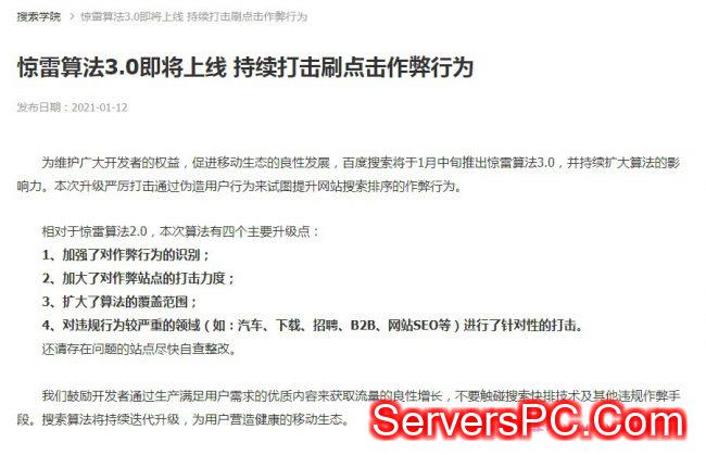 为维护广大开发者的权益,促进移动生态的良性发展,百度搜索将于1月中旬推出惊雷算法3.0,并持续扩大算法的影响力。本次升级严厉打击通过伪造用户行为来试图提升网站搜索排序的作弊行为。