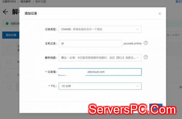 到域名服务商找到域名解析的入口,添加2条记录。如图所示主机记录分别为WWW和@ 记录值是CNAME地址,如果你的域名服务商不支持把@主机记录用CNAME方式解析,就用A记录,记录值填写IP地址