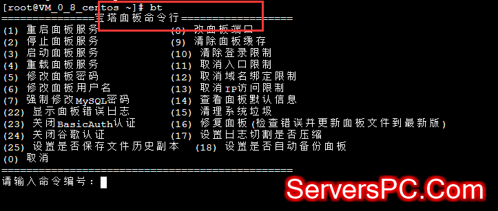 安装完成后,我们接着再命令行输入bt,这个时候就会显示面板的使用帮助菜单选项。